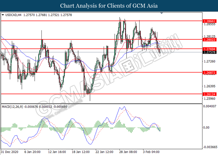 USDCAD, H4: USDCAD telah didagang dengan lebih rendah selepas ia memecah tahap sokongan sebelumnya di 1.2770. MACD yang menunjukkan isyarat momentum bearish yang berterusan mencadangkan pasangan ini untuk didagang dengan lebih rendah dan menuju ke arah tahap sokongan di 1.2800.