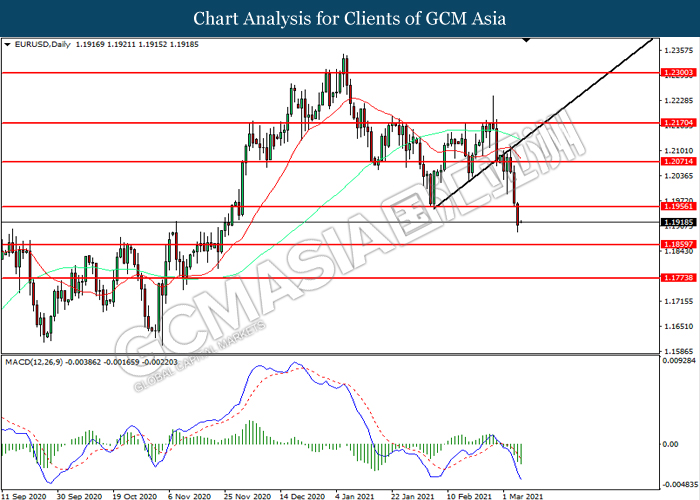 Indeks dolar yang mengukur nilainya berbanding sekumpulan enam mata wang utama telah melanjutkan keuntungannya selepas data-data pekerjaan yang penting telah memberikan bacaan yang sangat positif dari rantan A.S. pada Jumaat yang lalu. Menurut kepada Bureau of Labor Statistiks, A.S. Nonfarm Payrolls telah meningkat dengan ketara dari bacaan terdahulu sebanyak 166K ke bacaan sebanyak 379K, lebih tinggi daripada jangkaan pasaran sebanyak 182K. Tambahan pula, Kadar Pengangguran A.S. telah menyusut dari bacaan terdahulu sebanyak 6.3% ke bacaan sebanyak 6.2%, yang juga lebih baik daripada jangkaan pasaran sebanyak 6.3%. Oleh kerana kedua-dua data yang penting daripada A.S. telah menunjukkan bacaan yang positif, yang selanjutnya meningkatkan keyakinan pasaran ke atas perkembangan ekonomi di A.S sambil mencetuskan momentum bullish ke atas Dolar A.S. Namun, Dolar A.S. telah mengehadkan keuntungannya selepas Senat A.S. meluluskan rancangan rangsangan ekonomi Covid-19 yang bernilai sebanyak $1.9 trilion pada hari Sabtu yang lalu. Rangsangan ekonomi A.S. yang agresif akan mencetuskan jangkaan inflasi yang lebih tinggi pada masa yang akan datang, yang selanjutnya mengurangkan daya tarikan ke atas Dolar A.S. Walau bagaimanapun, para pelabur akan memantau perkembangan mengenai pergerakan ke atas hasil Perbendeharaan AS pada minggu ini serta perkembangan vaksin Covid-19 untuk menerima isyarat dagangan yang lanjutnya. Semasa penulisan, Indeks Dolar telah meningkat sebanyak 0.39% ke 91.98.