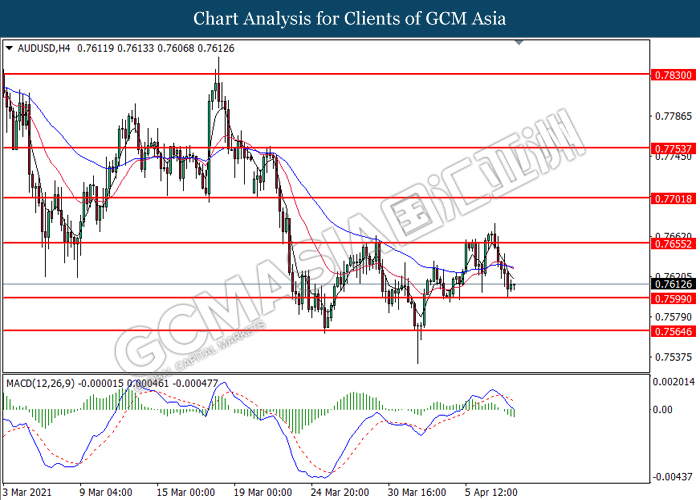AUDUSD, H4: AUDUSD telah didagang dengan lebih rendah selepas ia berundur dari tahap rintangan di 0.7655. MACD yang memaparkan momentum bearish yang berterusan mencadangkan pasangan ini untuk melanjutkan kerugiannya dan menuju ke arah tahap sokongan di 0.7600.