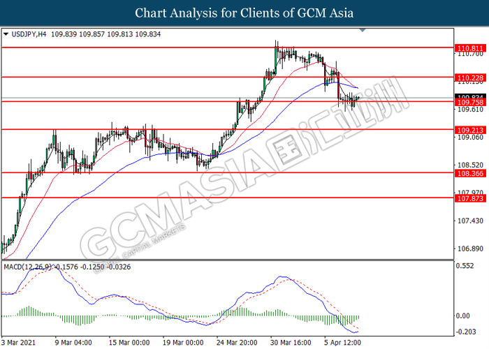 USDJPY, H4: USDJPY telah didagang dengan lebih tinggi selepas ia melantun dari tahap sokongan di 109.75. MACD yang memaparkan isyarat momentum bearish yang berkurangan mencadangkan pasangan ini untuk didagang dengan lebih tinggi dan menuju ke arah tahap rintangan di 110.20.
