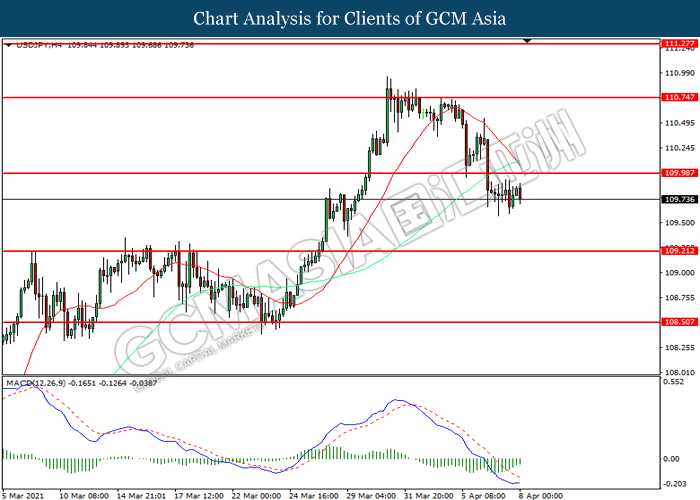 USDJPY, H4: USDJPY telah didagang dengan lebih rendah selepas ia memecah tahap sokongan terdahulu 110.00. Namun, MACD yang memaparkan momentum bearish yang berkurangan mencadangkan pasangan ini untuk mengalami pembetulan teknikal bagi jangka pendek.