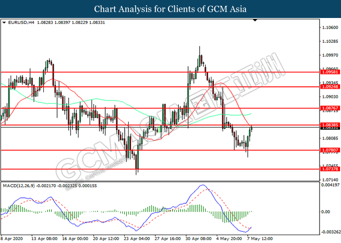EURUSD, H4: EURUSD telah didagang dengan lebih tinggi sementara kini menguji di tahap rintangan 1.0840. MACD yang memaparkan momentum bearish yang berkurangan mencadangkan pasangan ini untuk melanjutkan keuntungannya selepas ia memecah tahap rintangan tersebut.