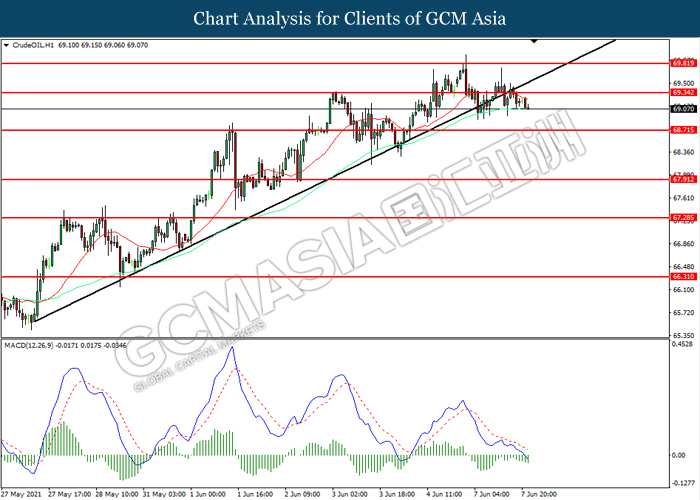 Bagi pasaran komoditi, harga minyak mentah telah menyusut sebanyak 0.33% ke $ 68.75 se tong semasa penulisan.. Pasaran minyak telah didagang dengan lebih rendah susulan dengan pengambilan untung setelah mencapai ketinggian 2 tahun. Walaupun begitu, trend keseluruhan harga minyak mentah tetap bullish pada jangkaan permintaan yang lebih baik dan pengeluar OPEC mengekalkan penawaran. Sebaliknya, harga emas meningkat sebanyak 0.01% ke $1899.15 se troy auns semasa penulisan susulan dengan penyusutan dalam Dolar AS.