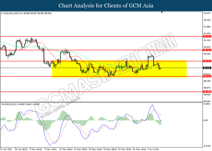 DOLLAR_INDX, H4: Indeks dolar telah didagang dengan lebih rendah selepas ia berundur dari tahap rintangan 90.25. MACD yang memaparkan momentum bearish mencadangkan indeks tersebut untuk melanjutkan kerugiannya ke arah tahap sokongan 89.50.