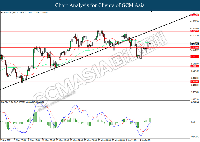 EURUSD, H4: EURUSD telah didagang dengan lebih tinggi selepas ia memecah tahap rintangan terdahulu 1.2170. Namun, MACD yang memaparkan momentum bullish mencadangkan pasangan ini untuk mengalami pembetulan teknikal bagi jangka pendek.