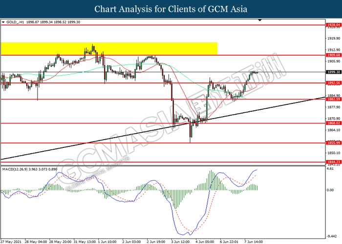 GOLD_, H1: Harga emas telah didagang dengan lebih tinggi selepas ia memecah tahap rintangan terdahulu 1892.55. Namun, MACD yang memaparkan momentum bullish yang berkurangan mencadangkan komoditi ini untuk mengalami pembetulan teknikal bagi jangka pendek.