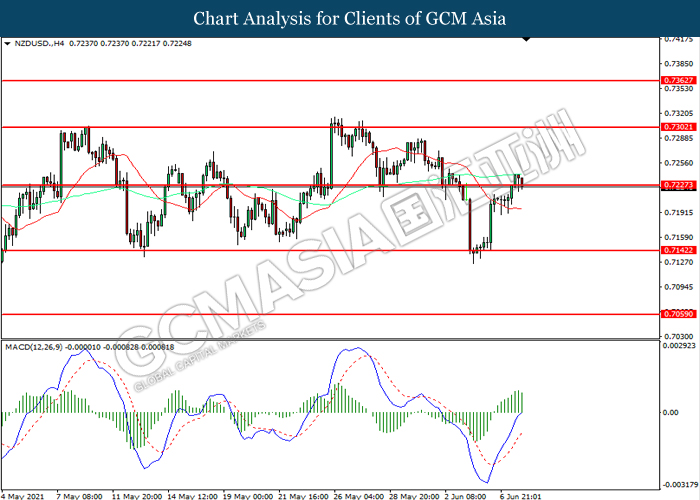 NZDUSD, H4: NZDUSD telah didagang dengan lebih tinggi sementara kini menguji di tahap rintangan 0.7725. Namun, MACD yang memaparkan mometnum bullish yang berkurangan mencadangkan pasangan ini untuk mengalami pembetulan teknikal bagi jangka pendek.
