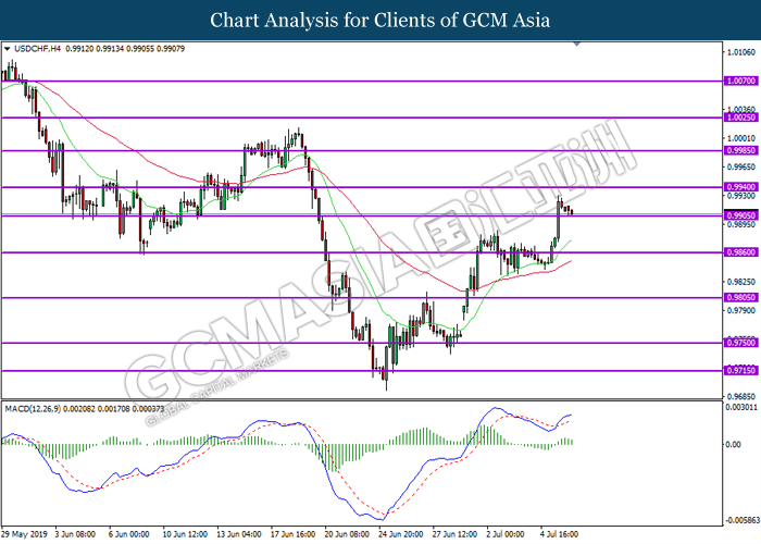 USDCHF, H4: USDCHF telah didagang dengan lebih rendah sementara menguji pada tahap sokongan 0.9905. MACD yang memaparkan penyusutan pada momentum bullish mencadangkan pasangan ini untuk melanjutkan kerugiannya selepas ia berjaya untuk memecahkan pada tahap sokongan tersebut.