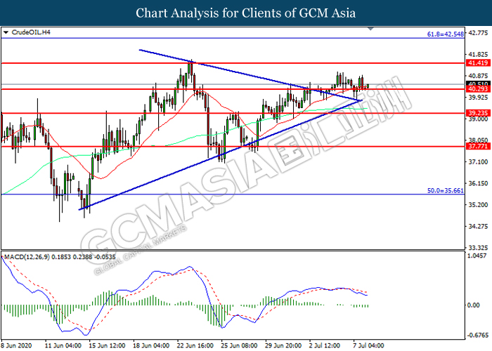 Bagi pasaran komoditi, harga minyak mentah telah menyusut sebanyak 0.05% ke $40.35 se tong semasa penulisan. Pasaran minyak mentah telah didagang dengan lebih rendah selepas data inventori yang suram telah dibebaskan. Menurut kepada American Petroleum Institute (API), A.S. API Weekly Crude Oil Stock telah meningkat dengan ketara dari bacaan terdahulu sebanyak -8.156M ke bacaan sebanyak 2.000M, lebih tinggi daripada jangkaan pasaran sebanyak 3.700M. Sebaliknya, harga emas telah melanjutkan keuntungannya sebanyak 0.04$ ke $1795.00 se troy auns susulan dengan kenaikan kes-kes koronavirus yang mendadak di Amerika Syarikat, yang selanjutnya meningkatkan permintaan ke atas aset selamat.