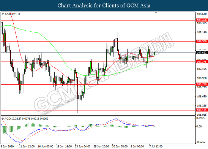 USDJPY, H4: USDJPY telah didagang dengan lebih tinggi selepas ia melantun dari tahap sokongan 107.35. Namun, MACD yang memaparkan momentum bearish mencadangkan pasangan ini untuk mengalami pembetulan teknikal bagi jangka pendek.