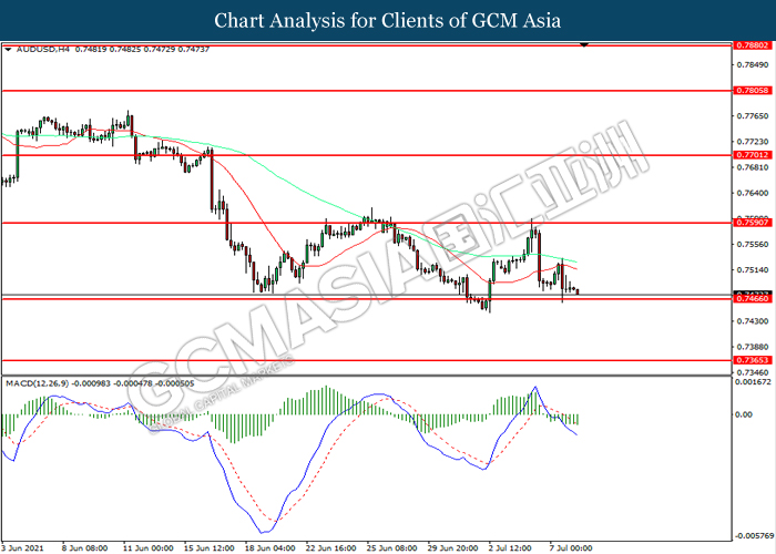 AUDUSD, H4: AUDUSD telah didagang dengan lebih rendah sementara kini menguji di tahap sokongan 0.7465. MACD yang memaparkan momentum bearish mencadangkan pasangan ini untuk melanjutkan kerugiannya selepas ia memecah tahap sokongan tersebut.