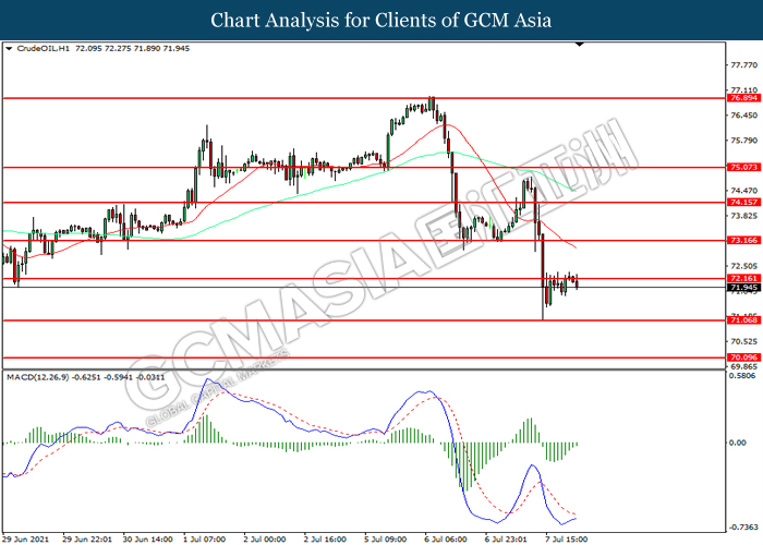 Bagi pasaran komoditi, harga minyak mentah meningkat sebanyak 0.05% $72.25 setong semasa penulsian. Pasaran minyak telah memulih dari harga rendah semalam di tengah-tengah data inventori yang positif telah mencetuskan momentum bullish ke atas pasaran minyak. Menurut kepada American Petroleum Institute, Stok Minyak Mentah Mingguan API A.S. memberi bacaan sebanyak -7.983M, lebih baik daripada ramalan pasaran sebanyak -3.925M. Sebaliknya, harga emas menyusut sebanyak 0.03% ke $1803,60 se troy auns semasa penulisan di tengah pengukuhan Dolar AS.