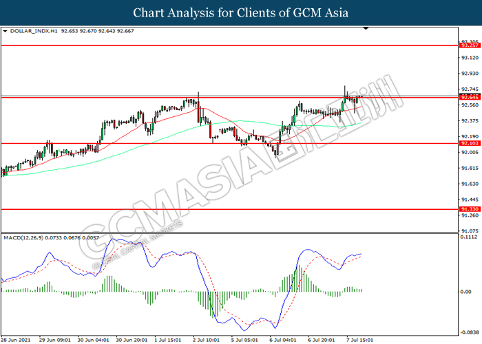 DOLLAR_INDX, H1: Indeks dolar telah didagang dengan lebih tinggi sementara kini menguji di tahap rintangan 92.65. Namun, MACD yang memaparkan momentum bullish yang berkurangan mencadangkan indeks tersebut untuk mengalami pembetulan teknikal bagi jangka pendek.