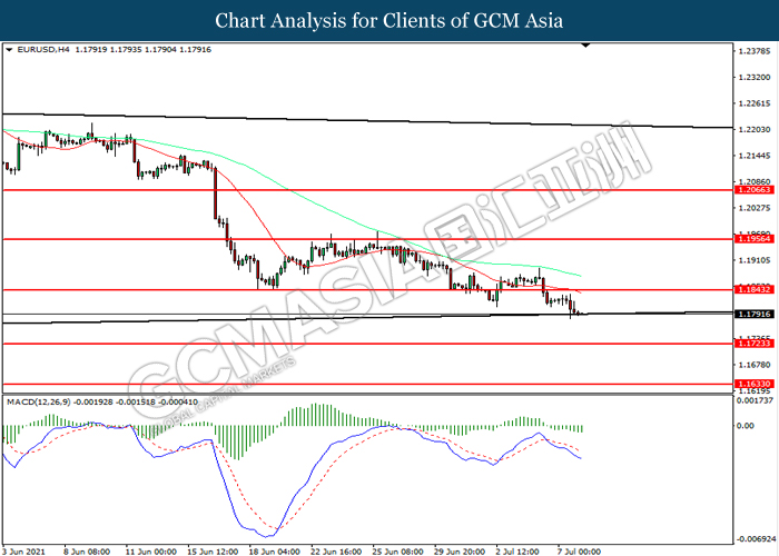 GOLD_, H4: Harga emas telah didagang dengan lebih tinggi selepas ia melantun dari tahap sokongan 1788.95. Namun, MACD yang memaparkan momentum bearish mencadangkan komoditi ini untuk mengalami pembetulan teknikal bagi jangka pendek.