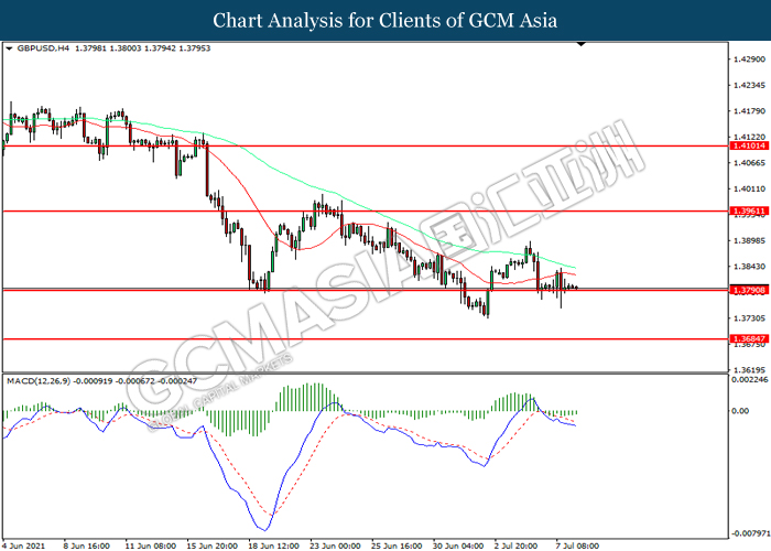 GBPUSD, H4: GBPUSD telah didagang dengan lebih rendah sementara kini menguji di tahap sokongan 1.3790. Namun, MACD yang memaparkan momentum bearish yang berkurangan mencadangkan pasangan ini untuk mengalami pembetulan teknikal bagi jangka pendek.