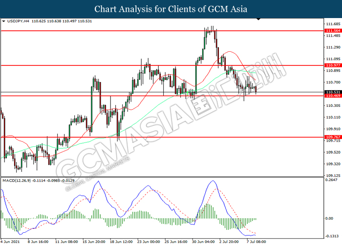 USDJPY, H4: USDJPY telah didagang dengan lebih rendah sementara kini menguji di tahap sokongan 110.45. Namun, MACD yang memaparkan momentum bearish yang berkurangan mencadangkan pasangan ini untuk mengalami pembetulan teknikal bagi jangka pendek.