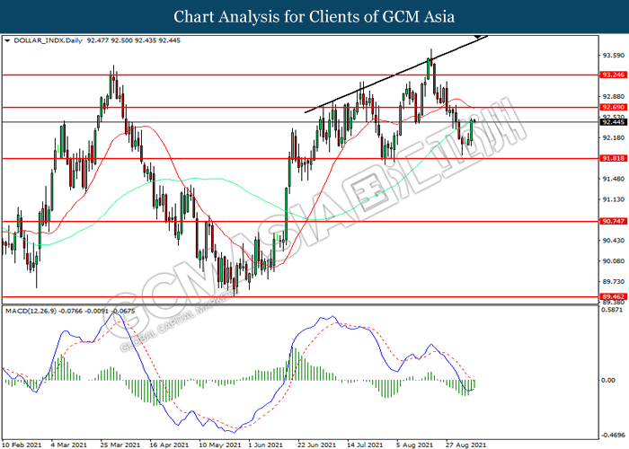 DOLLAR_INDX, Daily: Indeks Dolar telah didagang dengan lebih tinggi selepas ia melantun dari tahap sokongan 91.80. MACD yang memaparkan momentum bearish yang berkurangan mencadangkan indeks tersebut untuk melanjutkan keuntungannya ke arah tahap rintangan 92.70.