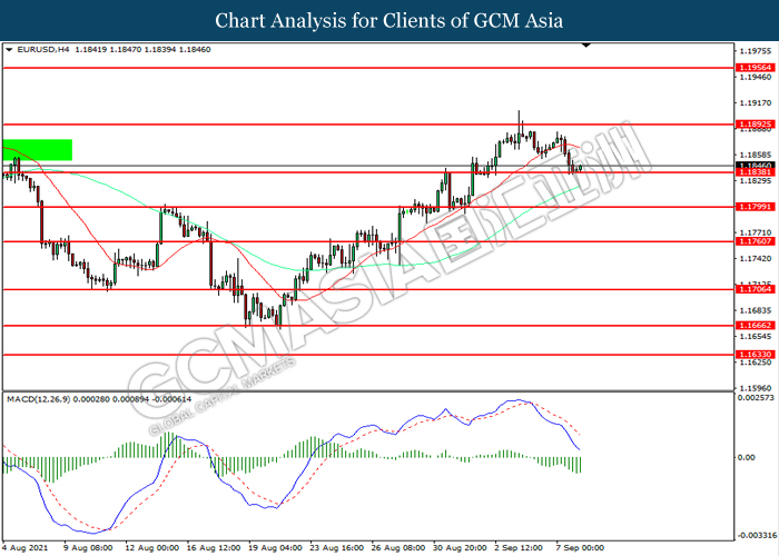 EURUSD, H4: EURUSD telah didagang dengan lebih rendah sementara kini menguji di tahap sokongan 1.3840. MACD yang memaparkan momentum bearish mencadangkan pasangan ini untuk melanjutkan kerugiannya selepas ia memecah tahap sokongan tersebut.