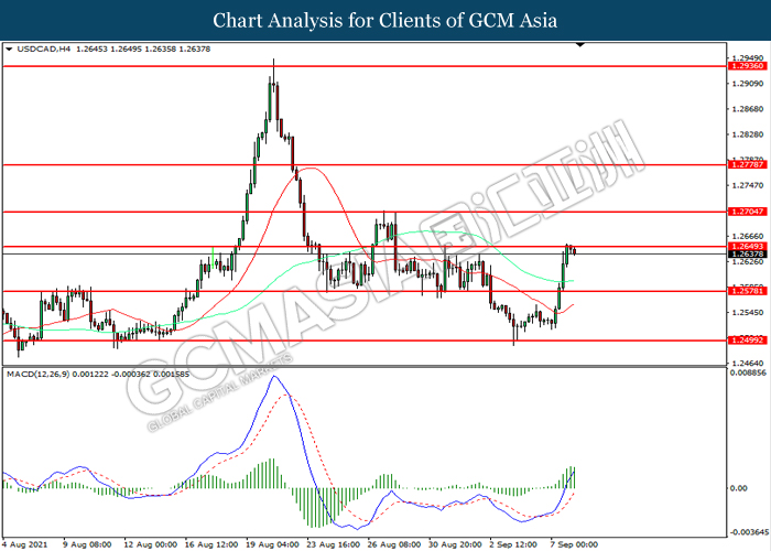 USDCAD, H4: USDCAD telah didagang dengan lebih tinggi sementara kini menguji di tahap rintangan di 1.2650. MACD yang memaparkan momentum bullish mencadangkan pasangan ini untuk melanjutkan keuntungannya selepas ia memecah tahap rintangan tersebut.