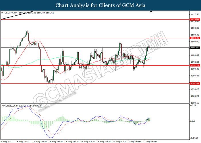 USDJPY, H4: USDJPY telah didagang dengan lebih tinggi selepas ia melantun dari tahap sokongan 109.75. MACD yang memaparkan momentum bullish mencadangkan pasangan ini untuk melanjutkan keuntungannya ke arah tahap rintangan 110.55.