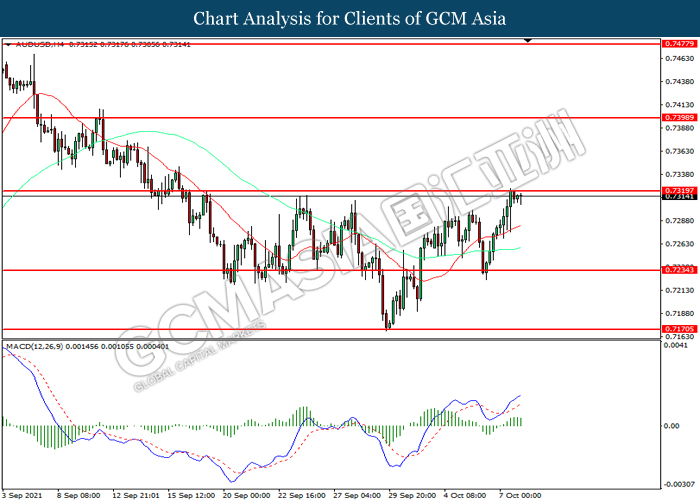 AUDUSD, H4: AUDUSD telah didagang dengan lebih tinggi sementara kini menguji di tahap rintangan 0.7320. MACD yang memaparkan momentum bullish mencadangkan pasangan ini untuk melanjutkan keuntungannya selepas ia memecah tahap rintangan tersebut.