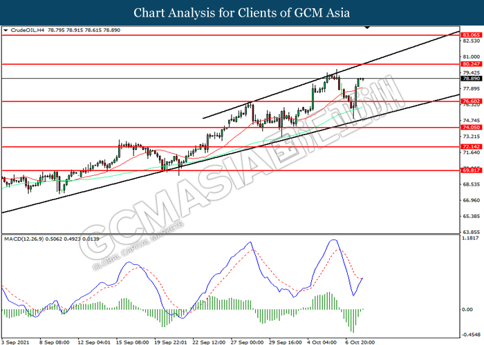 CrudeOIL, H4: Harga minyak mentah telah didagang dengan lebih tinggi selepas ia melantun dari tahap sokongan 76.60. MACD yang memaparkan momentum bearish mencadangkan komoditi ini untuk melanjutkan keuntungannya ke arah tahap rintangan 80.25.