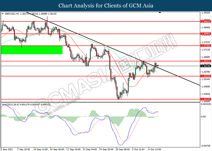 GBPUSD, H4: GBPUSD telah didagang dengan lebih tinggi sementara kini menguji di tahap rintangan 1.3640. MACD yang memaparkan momentum bullish mencadangkan pasangan ini untuk melanjutkan keuntungannya selepas ia memecah tahap rintangan tersebut.