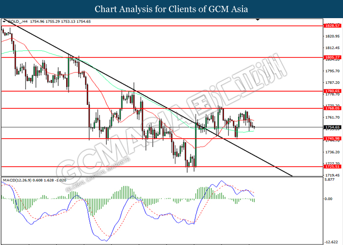GOLD_, H4: Harga emas telah didagang dengan lebih rendah selepas ia berundur dari tahap rintangan 1768.05. MACD yang memaparkan momentum bearish mencadangkan komoditi ini untuk melanjutkan kerugiannya ke arah tahap sokongan 1746.00.