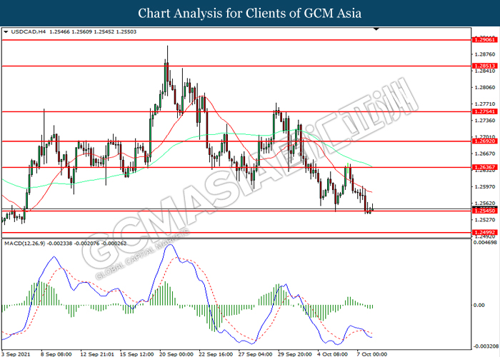 USDCAD, H1: USDCAD telah didagang dengan lebih rendah sementara kini menguji di tahap sokongan 1.2545. MACD yang memaparkan momentum bearish mencadangkan pasangan ini untuk melanjutkan kerugiannya selepas ia memecah tahap sokongan tersebut.