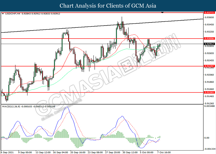 USDCHF, H4: USDCHF telah didagang dengan lebih tinggi sementara kini menguji di tahap rintangan 0.9305. MACD yang memaparkan momentum bullish mencadangkan pasangan ini untuk melanjutkan keuntungannya selepas ia memecah tahap rintangan tersebut.