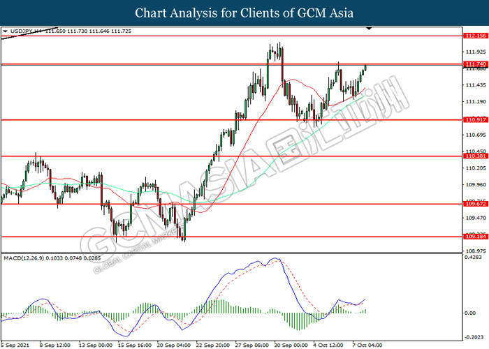 USDJPY, H4: USDJPY telah didagang dengan lebih tinggi sementara kini menguji di tahap rintangan 111.75. MACD yang memaparkan momentum bullish mencadangkan pasangan ini untuk melanjutkan keuntungannya selepas ia memecah tahap rintangan tersebut.