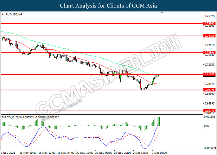 AUDUSD, H4: AUDUSD telah didagang dengan lebih tinggi sementara kini menguji di tahap rintangan 0.7125. MACD yang memaparkan momentum bullish mencadangkan pasangan ini untuk melanjutkan keuntungannya selepas ia memecah tahap rintangan tersebut.