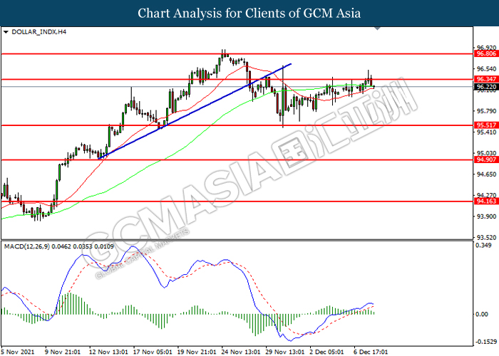 DOLLAR_INDX, H4: Indeks Dolar telah didagang dengan lebih tinggi sementara kini menguji di tahap rintangan 96.35. Namun, MACD yang memaparkan momentum bullish yang berkurangan mencadangkan indeks tersebut untuk mengalami pembetulan teknikal bagi jangka pendek.