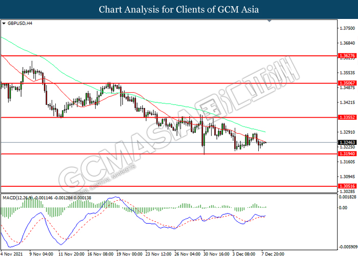 GBPUSD, H4: GBPUSD telah didagang dengan lebih rendah sementara kini menguji di tahap sokongan 1.3195. Namun, MACD yang memaparkan momentum bearish yang berkurangan mencadangkan pasangan tersebut untuk mengalami pembetulan teknikal bagi jangka pendek.