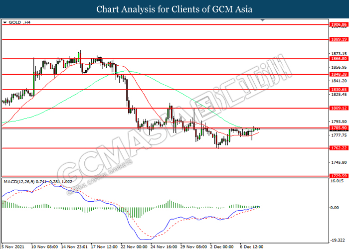 GOLD_, H4: Harga emas telah didagang dengan lebih tinggi sementara kini menguji di tahap rintangan 1785.90. Namun, MACD yang memaparkan momentum bullish yang berkurangan mencadangkan komoditi ini untuk mengalami pembetulan teknikal bagi jangka pendek.