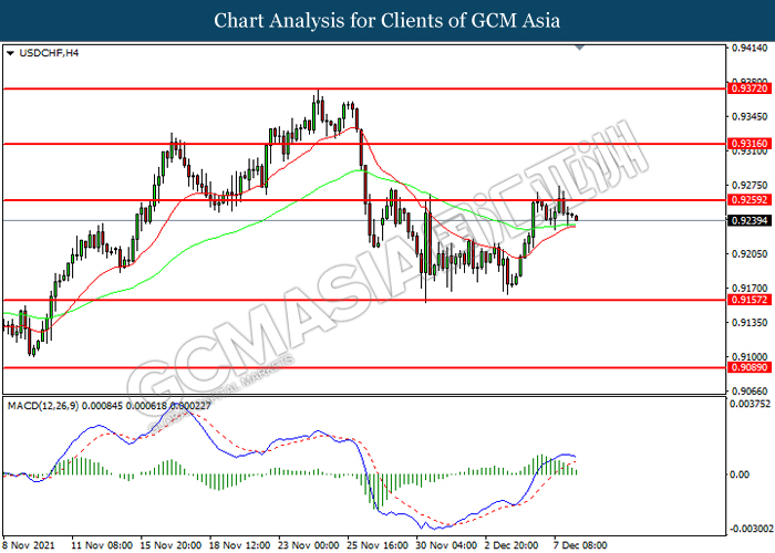 USDCHF, H4: USDCHF telah didagang dengan lebih tinggi sementara kini menguji di tahap rintangan 0.9260. Namun, MACD yang memaparkan momentum bullish yang berkurangan mencadangkan pasangan ini untuk mengalami pembetulan teknikal bagi jangka pendek.
