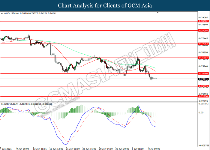 AUDUSD, H4: AUDUSD telah didagang dengan lebih rendah selepas ia memecah tahap sokongan terdahulu 0.7465. Namun, MACD yang memaparkan momentum bearish yang berkurangan mencadangkan pasangan ini untuk mengalami pembetulan teknikal bagi jangka pendek.