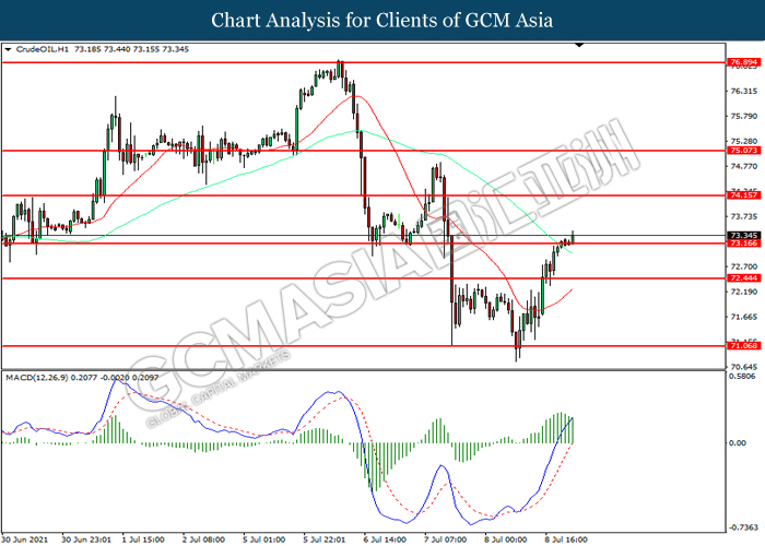 CrudeOIL, H1: Harga minyak mentah telah didagang dengan lebih tinggi selepas ia memecah tahap rintangan terdahulu 73.15. Namun, MACD yang memaparkan momentum bullish yang berkurangan mencadangkan komoditi ini untuk mengalami pembetulan teknikal bagi jangka pendek.
