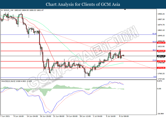 GOLD_, H4: Harga emas telah didagang dengan lebih rendah selepas ia berundur dari tahap rintangan 1813.05. MACD yang memaparkan momentum bearish mencadangkan komoditi ini untuk melanjutkan kerugiannya ke arah tahap sokongan 1788.95.