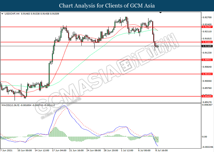 USDCHF, H4: USDCHF telah didagang dengan lebih rendah selepas ia memecah tahap sokongan terdahulu 0.9165. MACD yang memaparkan momentum bearish mencadangkan pasangan ini untuk melanjutkan kerugiannya ke arah tahap sokongan 0.9095.