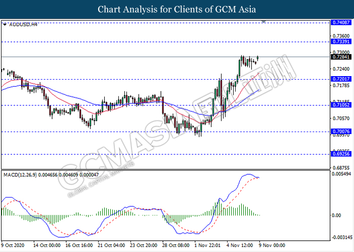AUDUSD, H4: AUDUSD telah didagang dengan rata susulan dengan pemecahan pada tahap rintangan sebelumnya 0.7200. Namun, MACD yang memaparkan isyarat momentum bullish yang berkurangan dengan permulaan formasi silang kematian mencadangkan pasangan ini untuk didagang dengan lebih rendah dalam jangka pendek ke arah tahap sokongan 0.7200.