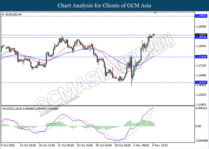 EURUSD, H4: EURUSD telah didagang dengan rata berhampiran dengan tahap sokongan selepas ia memecah tahap rintangan sebelumnya 1.1875. Namun, MACD yang memaparkan isyarat momentum bullish yang berkurangan mencadangkan pasangan ini untuk didagang dengan lebih rendah selepas ia memecah kembali ke arah tahap 1.1875.