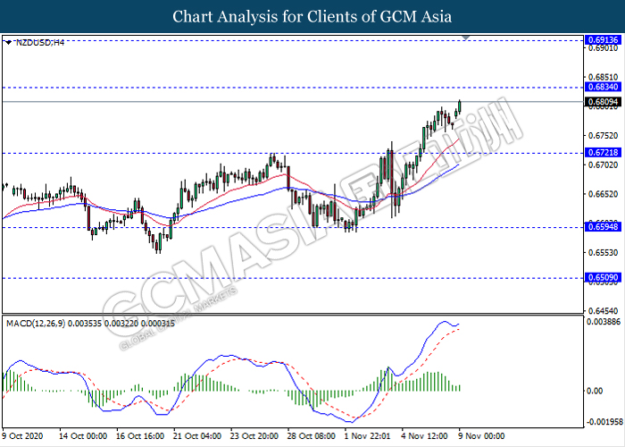 NZDUSD, H4: NZDUSD telah didagang dengan lebih tinggi sementara ia sedang menguji berhampiran dengan tahap rintangan 0.6835. MACD yang memaparkan isyarat momentum bullish yang berterusan mencadangkan pasangan ini untuk melanjutkan keuntungannya selepas ia memecah tahap rintangan tersebut.