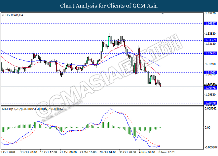 USDCAD, H4: USDCAD telah didagang dengan lebih rendah sementara ia sedang menguji tahap sokongan 1.2995. Namun, MACD yang memaparkan isyarat momentum bearish mencadangkan pasangan ini untuk didagang dengan lebih tinggi sebagai pembetulan teknikal jangka pendek ke arah tahap rintangan 1.3105.