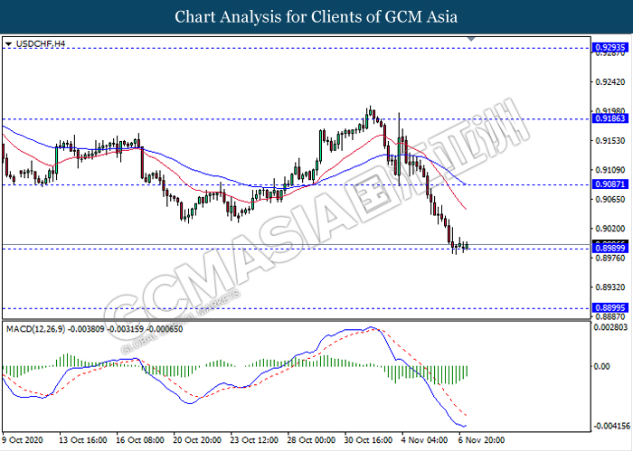 USDCHF, H4: USDCHF telah didagang dengan lebih rendah sementara ia sedang menguji tahap sokongan 0.8990. Namun, MACD yang memaparkan isyarat momentum bearish yang berkurangan mencadangkan pasangan ini untuk mengalami pembetulan teknikal jangka pendek ke arah tahap rintangan 0.9085.