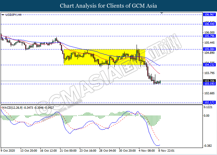 USDJPY, H4: USDJPY telah didagang dengan lebih rendah sementara ia sedang menguji tahap sokongan 103.20. Namun, MACD yang memaparkan isyarat momentum bearish yang berkurangan mencadangkan pasangan ini untuk didagang dengan lebih tinggi sebagai pembetulan teknikal ke arah tahap rintangan 104.25.