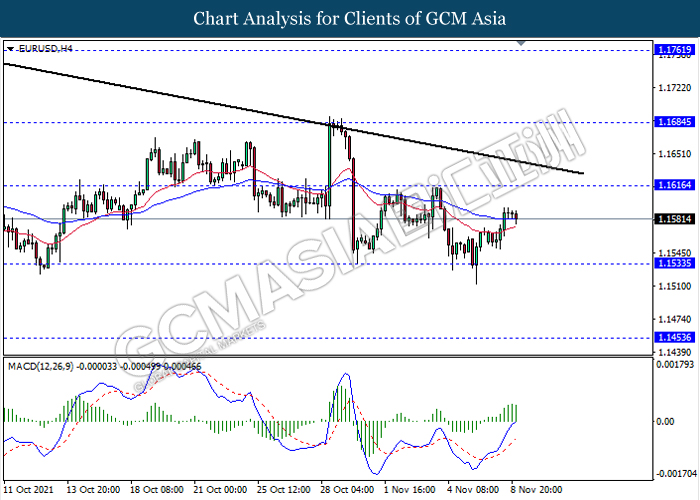 EURUSD, H4: EURUSD telah didagang dengan lebih tinggi susulan dengan lantunan dari tahap sokongan 1.1535. MACD yang memaparkan isyarat momentum bullish mencadangkan pasangan ini untuk melanjutkan lantunannya ke arah tahap rintangan 1.1615.