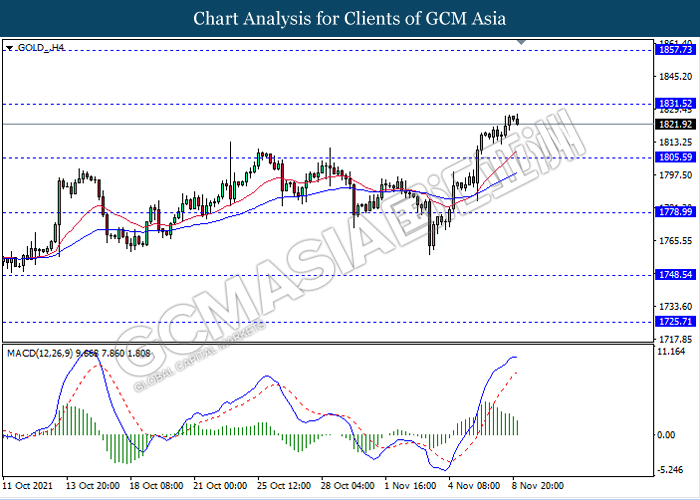 GOLD_, H4: Harga emas telah didagang dengan lebih tinggi sementara ia sedang menguji berhampiran dengan tahap rintangan 1831.50. Namun, MACD yang memaparkan isyarat momentum bullish yang berkurangan mencadangkan komoditi ini untuk mengalami pembetulan teknikal ke arah tahap sokongan 1805.60.