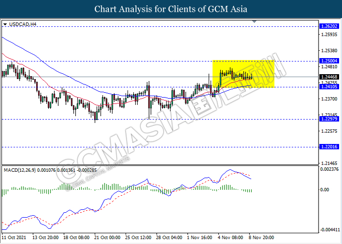 USDCAD, H4: USDCAD telah didagang dengan rata dalam saluran sisi. Namun, MACD yang memaparkan isyarat momentum bearish mencadangkan pasangan ini untuk didagang dengan lebih rendah dalam jangka pendek ke arah tahap sokongan 1.2410.