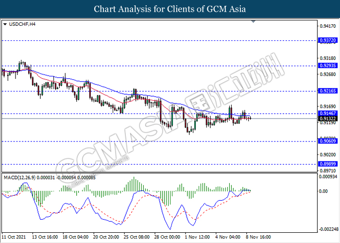 USDCHF, H4: USDCHF telah didagang dengan lebih rendah susulan dengan pengunduran dari tahap rintangan 0.9145. MACD yang memaparkan isyarat momentum bullish yang berkurangan mencadangkan pasangan ini untuk melanjutkan pengundurannya ke arah tahap sokongan 0.9060.